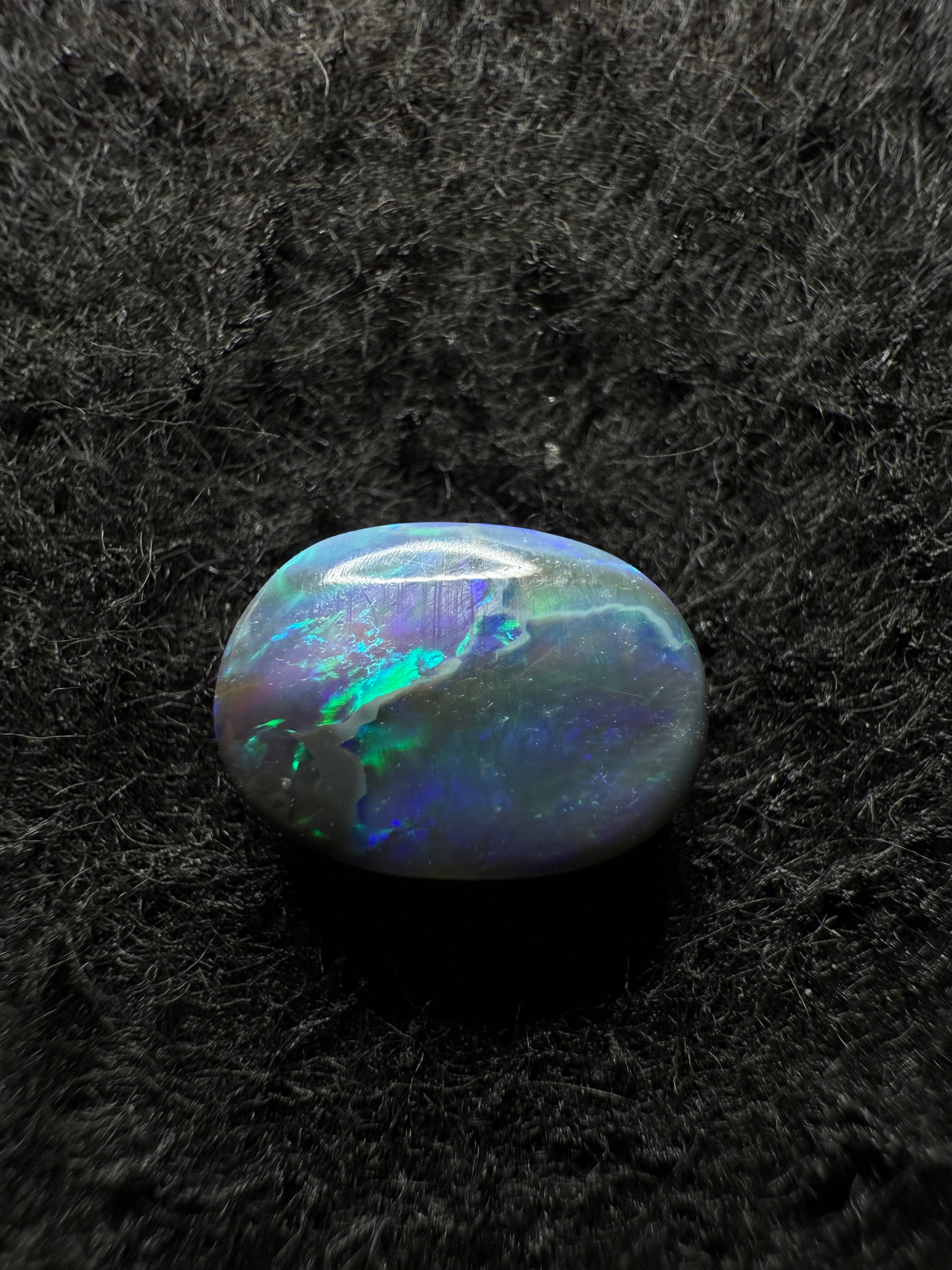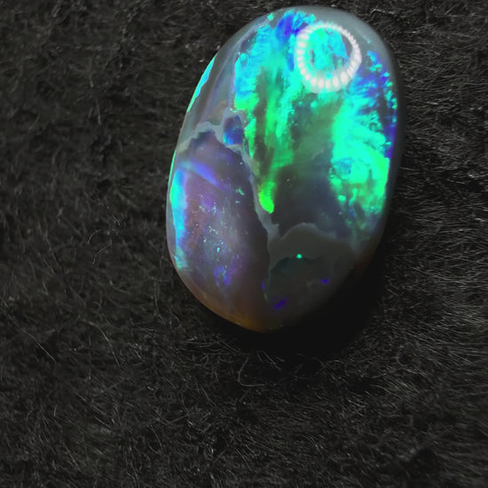 This exceptional N4 opal reveals intense flashes of Green Blue colour shifting dramatically with movement and light. The broad flash pattern creates striking visual depth, offering a balance of brilliance and rarity that defines world-class Lightning Ridge material.